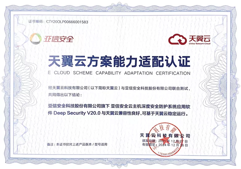 互认!亚信安全信舱云主机安全产品与天翼云完成适配