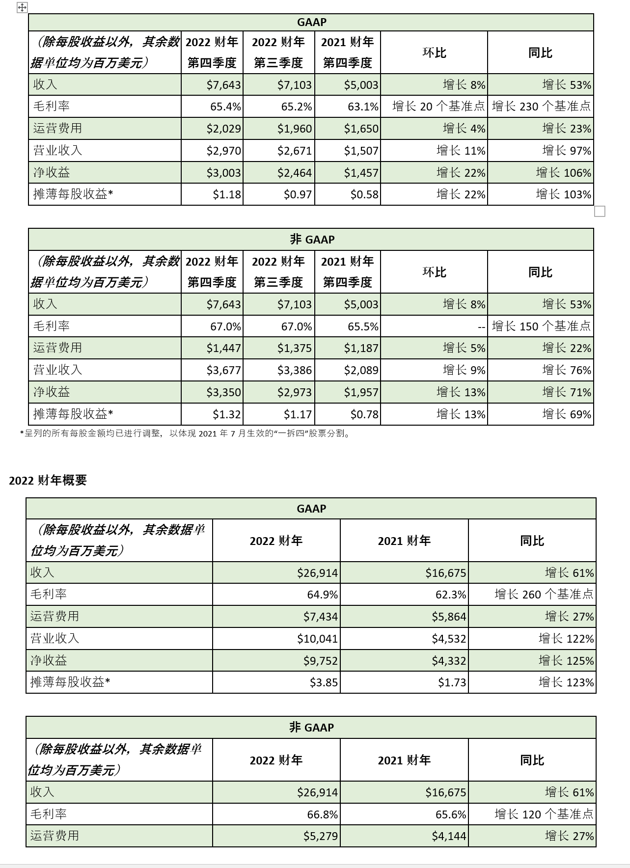 公司2022财年全年收入创下269.1亿美元的纪录,较上一财年的166.8亿美元增长61%。全年GAAP摊薄每股收益创下3.85美元的纪录,较上一财年的1.73美元增长123%。全年非GAAP摊薄每股收益为4.44美元,较上一财年的2.50美元增长78%。