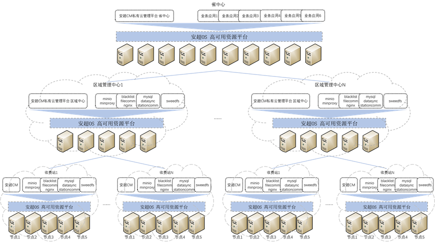 ● 在每个收费站、区域管理中心及省中心内部署ArcherOS超融合平台和ArcherCM云管理平台,为业务应用提供计算、网络和存储等资源,同时为区域管理中心和省中心提供纳管数据;