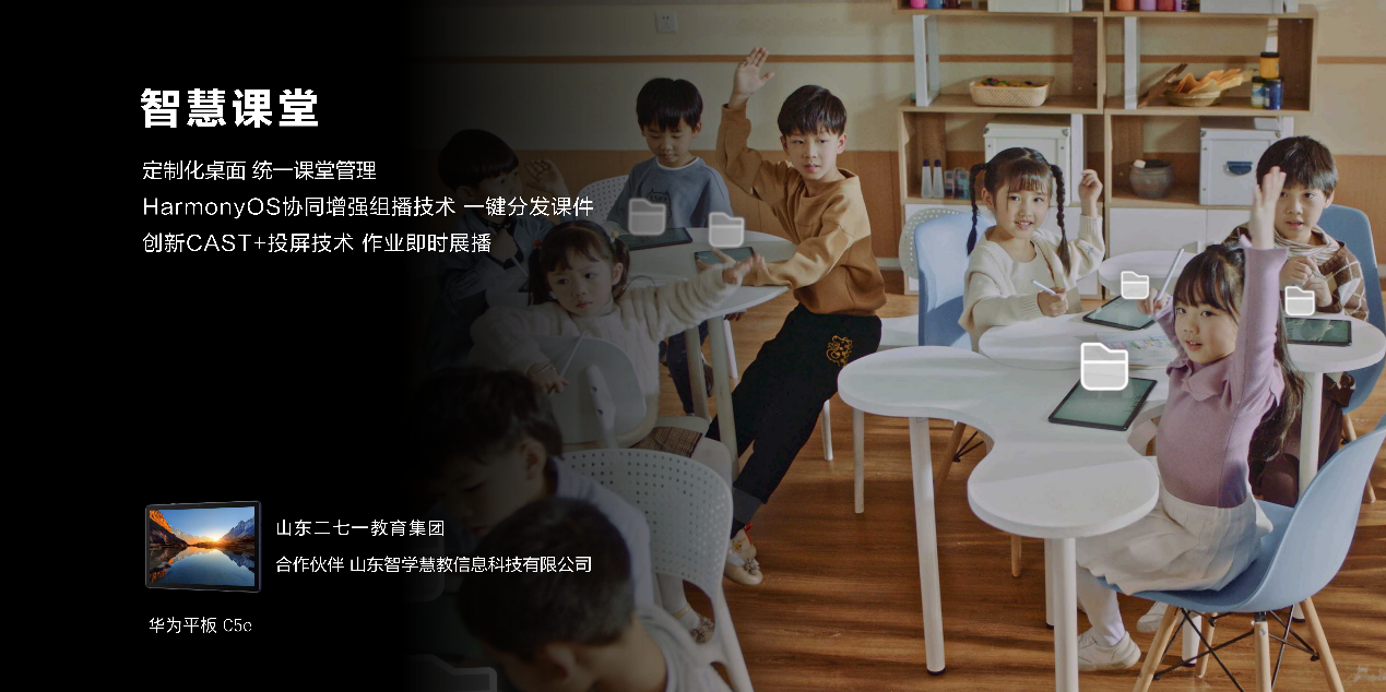 在教育领域,基于HarmonyOS配合华为自研增强组播技术,快捷分发课件作业; 创新Cast+投屏技术,实现多屏内容汇聚,作业实时展播分享。目前华为商用平板C5e与山东智学慧教信息科技有限公司合作推出的智慧课堂解决方案,已经在山东二七一教育集团成功落地。
