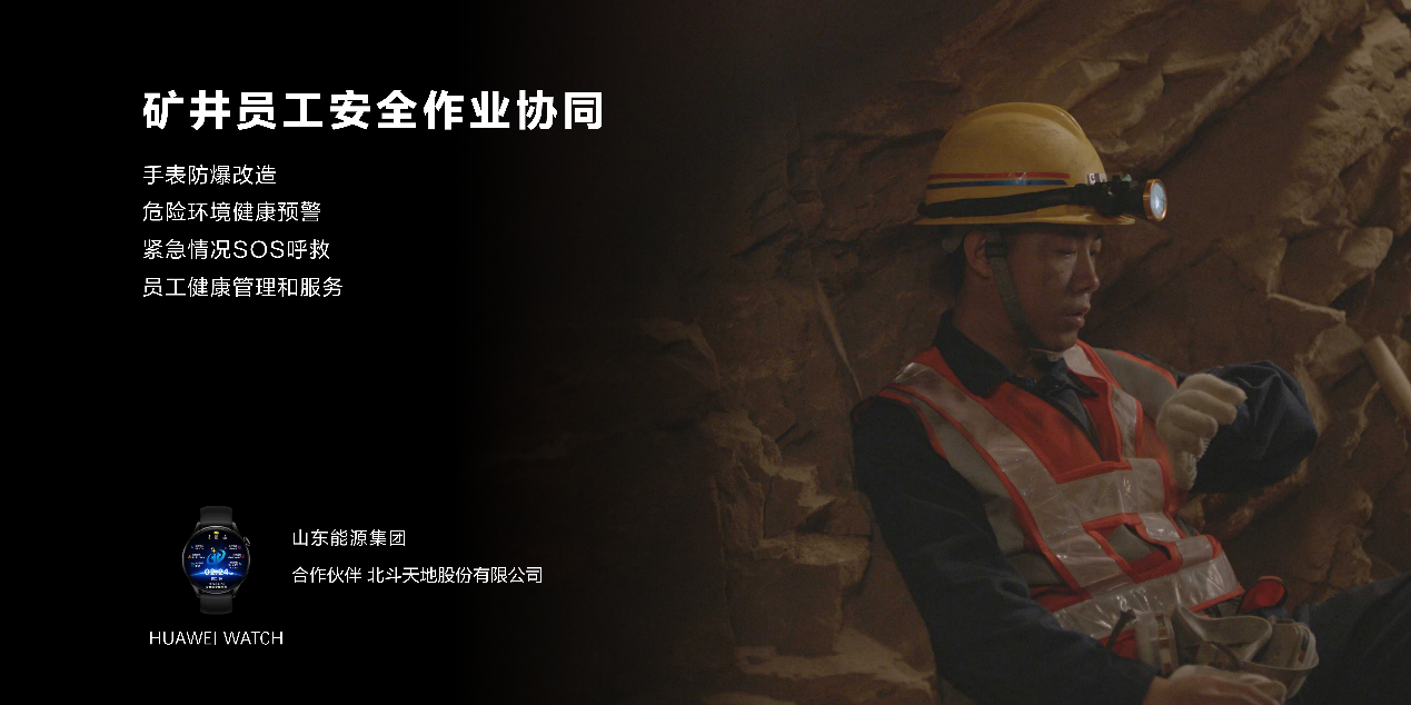 在煤矿企业,长期以来因缺乏相关便携预警设备和救援难度过大导致作业人员的安全难以保障,华为协同行业合作伙伴北斗天地股份有限公司推出矿井员工安全作业协同解决方案,通过华为WATCH B7手表等智能穿戴设备与智能矿灯、便携仪等设备深度融合,实现井下人员实时的体征监测、人员定位、高风险环境预警等功能,有情况随时寻呼传达信息;作业人员也可以使用穿戴设备一键发起SOS呼救;出现心率异常等健康状况,会自动进行预警,给矿业及员工的生命财产提供了坚实的保障,更好地防患于未然。