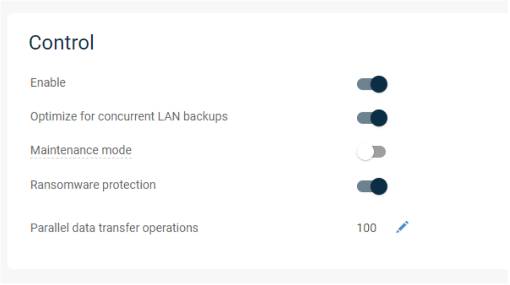 5. 在Control(控制)部分,将Ransomware protection(勒索软件保护) 切换键拨动到右侧;成功启用不可变数据备份副本的勒索软件保护功能。
