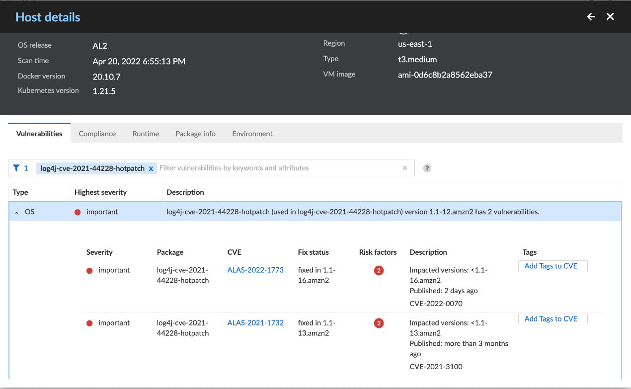 Prisma Cloud用户可以在漏洞选项卡下识别受影响的主机。平台会检测热补丁程序包,并对运行漏洞版本的虚拟机发出警报。如要搜索这些漏洞,可以使用相关的Amazon Linux Security Advisories(ALAS)ID:ALAS-2021-1554、ALAS-2021-1732、ALAS-2022-1580和ALAS-2022-1773。