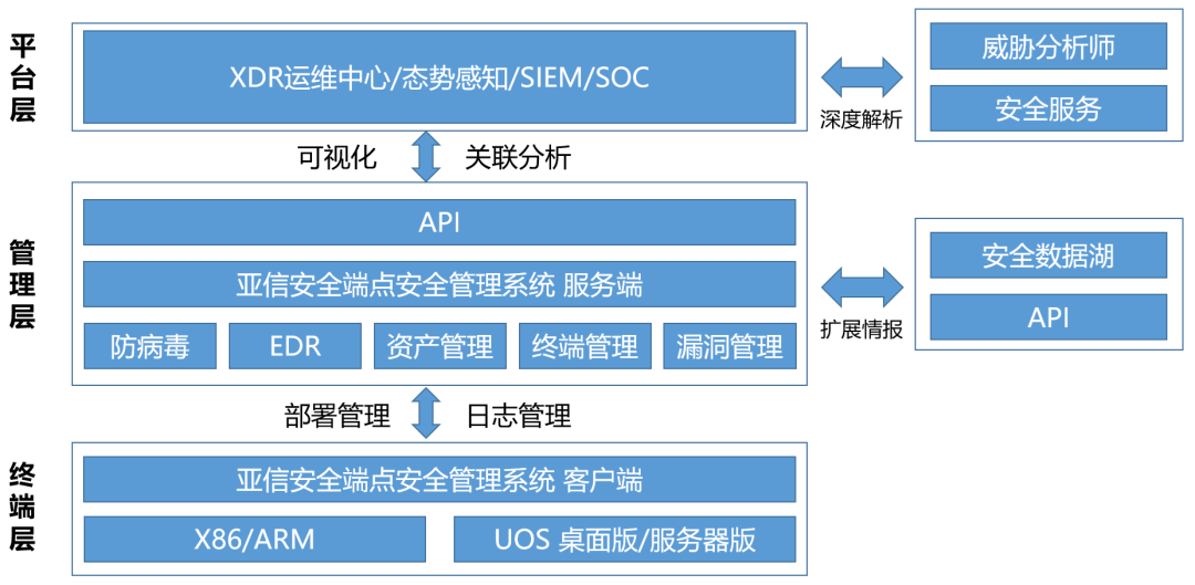 面对当前国内基础软件操作系统的发展需求和趋势,亚信安全携手统信软件联合推出了端点安全管理系统联合解决方案。该方案基于亚信安全信端端点安全管理系统V8.0,利用统信UOS提供的UKSI接口深度适配统信UOS服务器和桌面操作系统,打造国产操作系统一体化的安全解决方案。