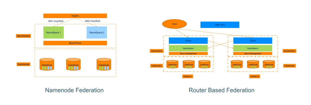 而在RBF的联邦方案中,尝试把“挂载表”从Client中抽离出来形成了Router,虽然Hadoop集群是独立的,但同时又增加了一个“State Store”组件,架构变得更复杂。