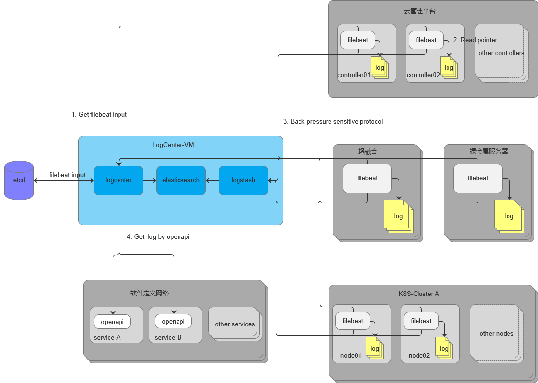 整体架构在ELK Stack开源框架的基础上,增加logcenter微服务来统一管理每个集群中filebeat的采集配置,云管理平台后端服务的采集配置是有初始模板的,并且可以在功能页面上编辑不同微服务的模板来动态修改采集的日志数据,新建或者导入的K8S集群采集配置需要每次调接口生成。对filebeat做了二次开发,使其通过定时调用logcenter接口来获取采集配置,配置在初始化之后都是存储在分布式缓存etcd中,来保证多集群环境下采集配置同步。
