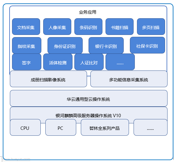 方案以基于自研KYSEC安全架构、内生安全的银河麒麟高级服务器操作系统V10为安全基础底座,华云通用型云操作系统为云平台管理软件,结合云计算本身的高可用、弹性特性以及底层操作系统的广泛适配性,共同承载高拍仪、成册扫描影像系统以及多功能信息采集系统在内的多款无纸化智慧办公产品。
