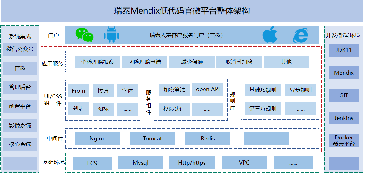 在瑞泰人寿官方微信公众号个险理赔平台项目的建设过程中,IT团队发现传统的纯java开发模式已经开始无法满足业务增长而带来的快速迭代要求,开发的成本也非常高。倘若继续采用传统的J2EE架构作为应用服务栈,开发业务应用所投入的人力和时间成本相对于市场的变化往往是疲于奔命。常常是应用还没投入使用,需求已经发生了变化。通过市场调研和用户推荐,在经过一段时间的研究论证和与市场上同类产品对比后团队认为:西门子低代码平台相对成熟且通用性强,在国内外市场都有过很多金融行业客户的成功案例,在应用性和适用性上可以满足瑞泰人寿信息化的要求。