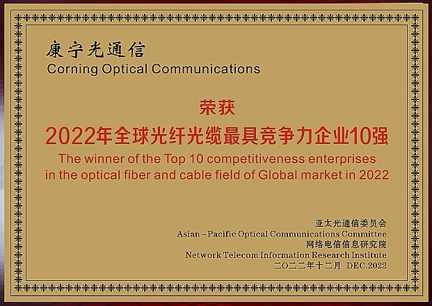 近日,在由亚太光通信委员会和网络电信信息研究院联合主办的《全球|中国光通信最具竞争力企业10强》评选活动中,康宁荣获《2022年全球光纤光缆最具竞争力企业10强》、《2022年中国光通信市场最具品牌竞争力企业10强》等荣誉。