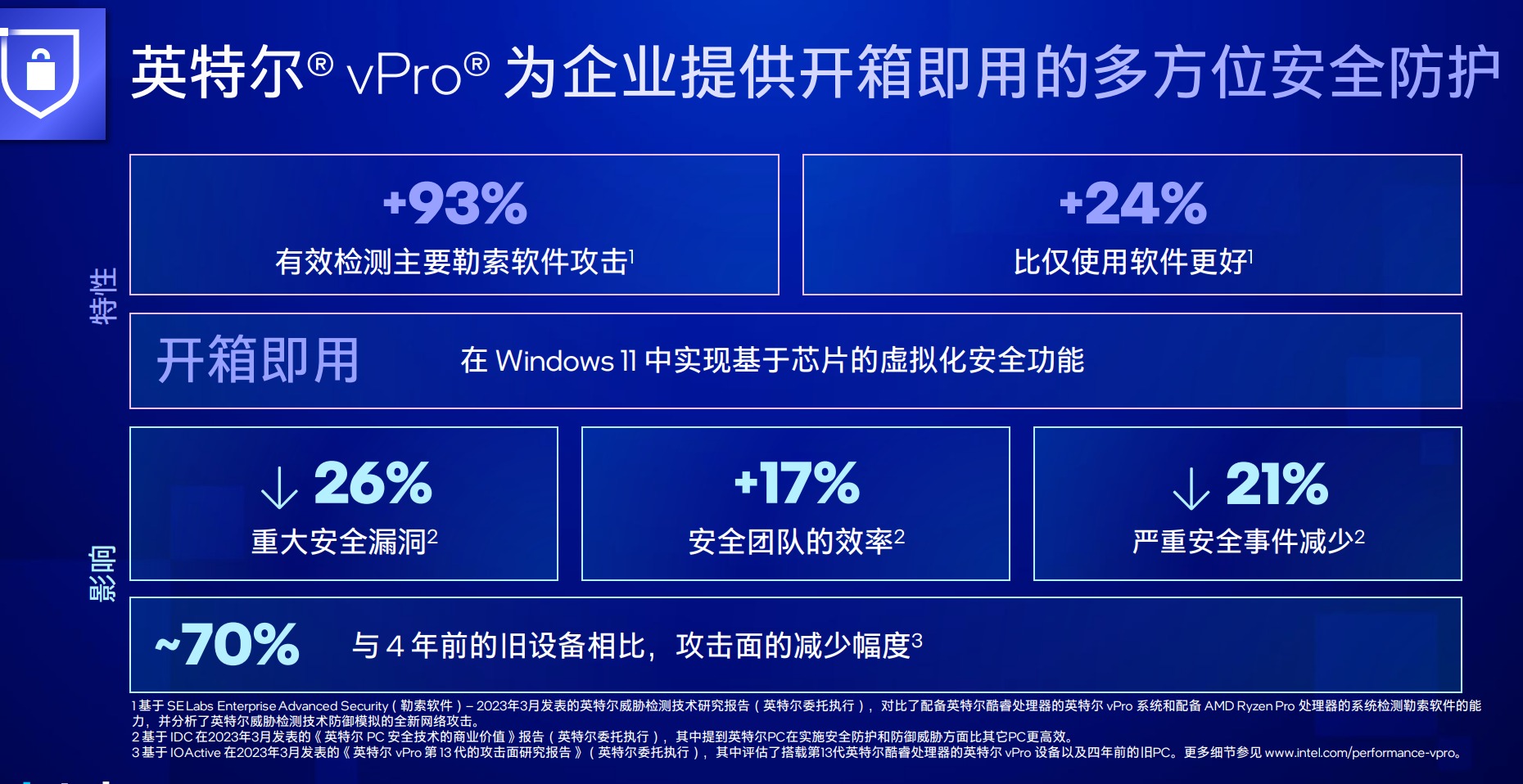 VPRO的安全策略不需要复杂的设置,在WINDWOS11系统下提供开箱即用的安全,在硬件层面对勒索软件的检测效率提升93%,安全重大漏洞下降26%,安全团队效率提升17%,严重的安全事件减少21%。