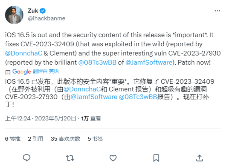 苹果日前发布的 iOS / iPadOS 16.5 更新已经修复了 ColdInvite 漏洞(追踪编号 CVE-2023-27930),推荐用户尽快升级。