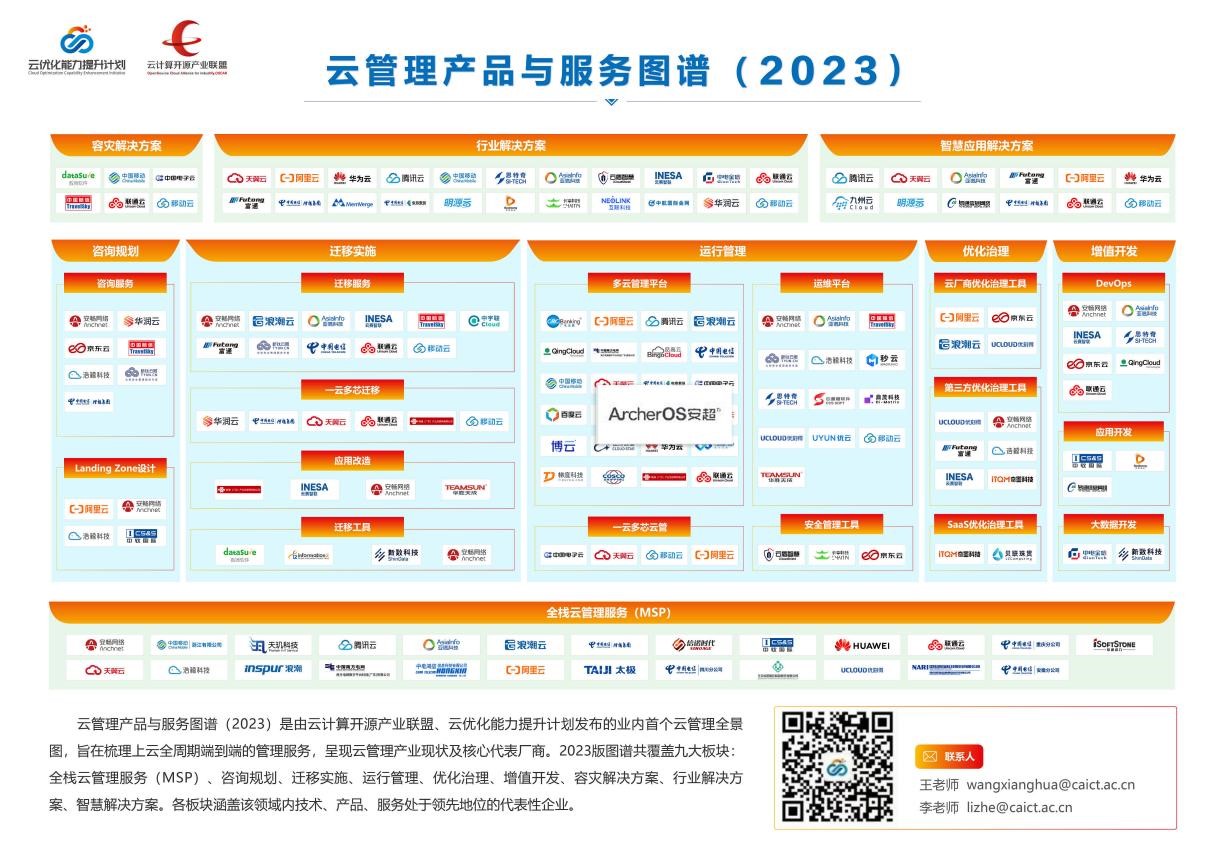云计算作为数字经济重点产业,成为数字化时代企业必选项。企业深度上云为云管理产业带来更多机遇。云管理从云迁移、云运维,拓展至上云全生命周期端到端的管理服务,云管理内涵不断深化。在此背景下,云计算开源产业联盟、云优化能力提升计划联合发布了产业内首个云管理全景图,旨在梳理上云全周期端到端的管理服务,呈现云管理产业现状及核心代表厂商。