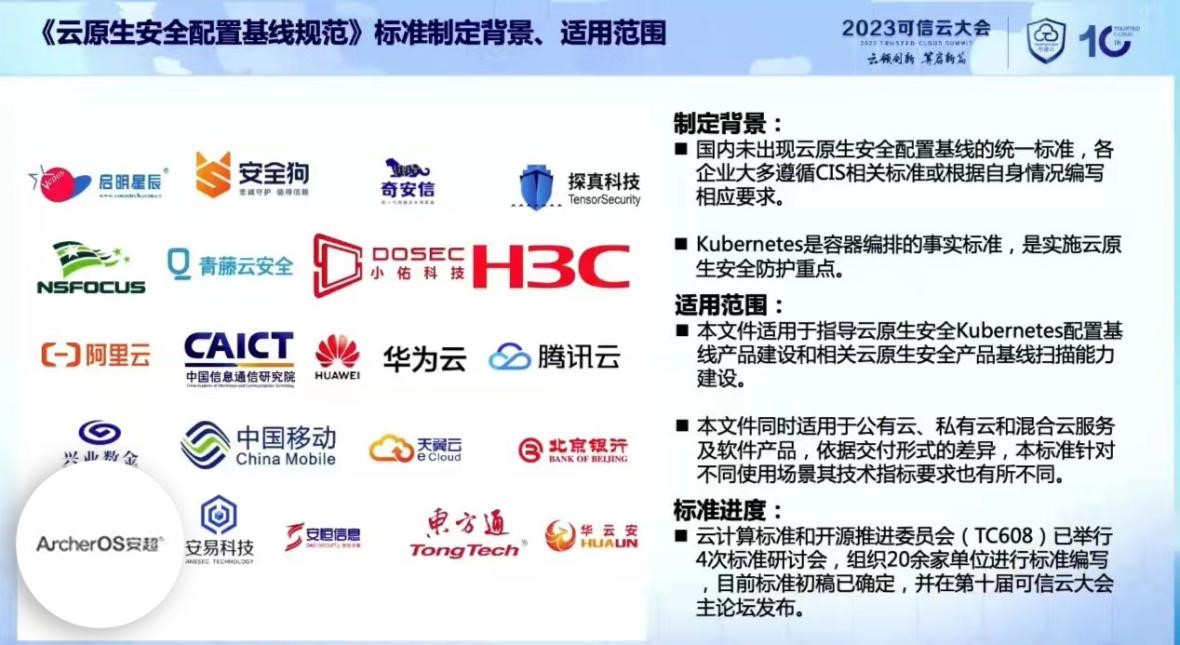在此次大会上,由中国信通院牵头指导,华为云、阿里云、腾讯云、安超云等科技企业参与的《云原生安全配置基线规范》标准正式发布。