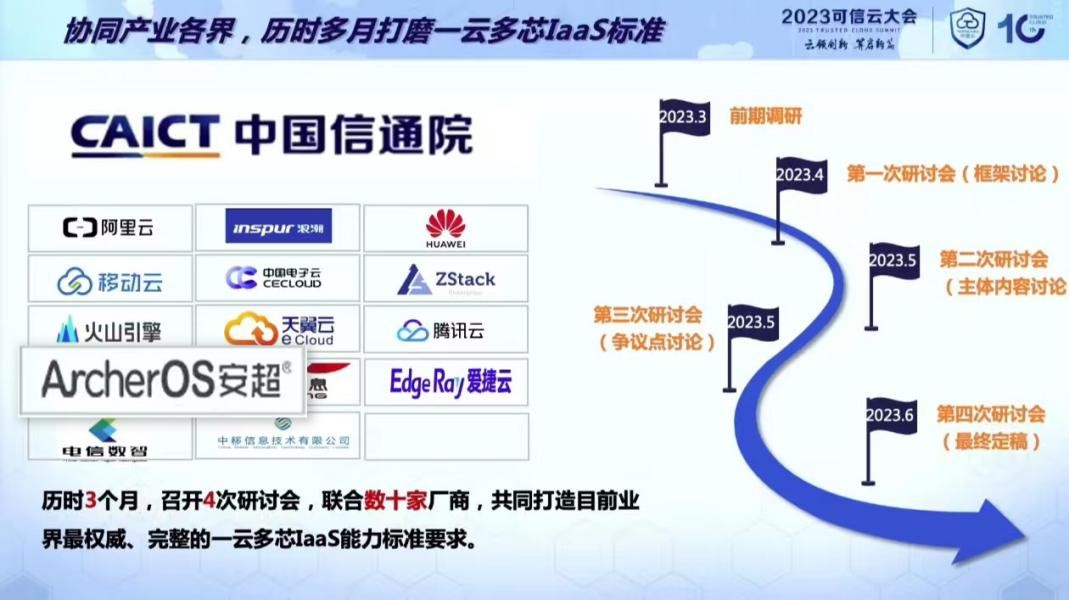 由中国信息通信研究院牵头,阿里云、浪潮、移动云、安超云等企业共同参与编制的《一云多芯IaaS平台能力要求》 在大会上正式发布。该标准历时3个月,召开4次研讨会,数十家厂商共同打造了目前业界最权威、完整的一云多芯IaaS能力标准要求。