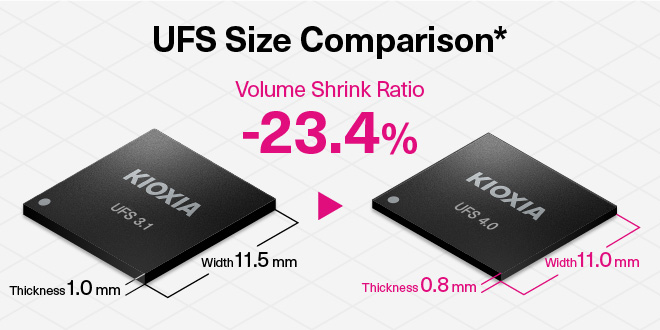 芯片封装尺寸甚至还可以影响到最终产品的大小,更小的芯片封装可以允许手机、平板、掌机腾出更多的内部空间安装电池,可以进行更多的个性化设计,增加产品竞争力。毕竟没有哪位同学可以接受掌机、手机与板砖是同一个尺寸。铠侠UFS 4.0可以做到体积相对上一代UFS 3.1缩小23.4%,给未来的产品设计提升留足了空间。